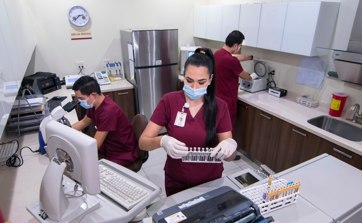 Laboratorio clínico y de microbiología con capacidades especializadas — único en hospital privado en Mexicali. Resultados precisos y oportunos bajo estrictos controles de calidad, disponible las 24 horas, los 365 días del año. Portal de resultados: resultados.almater.mx